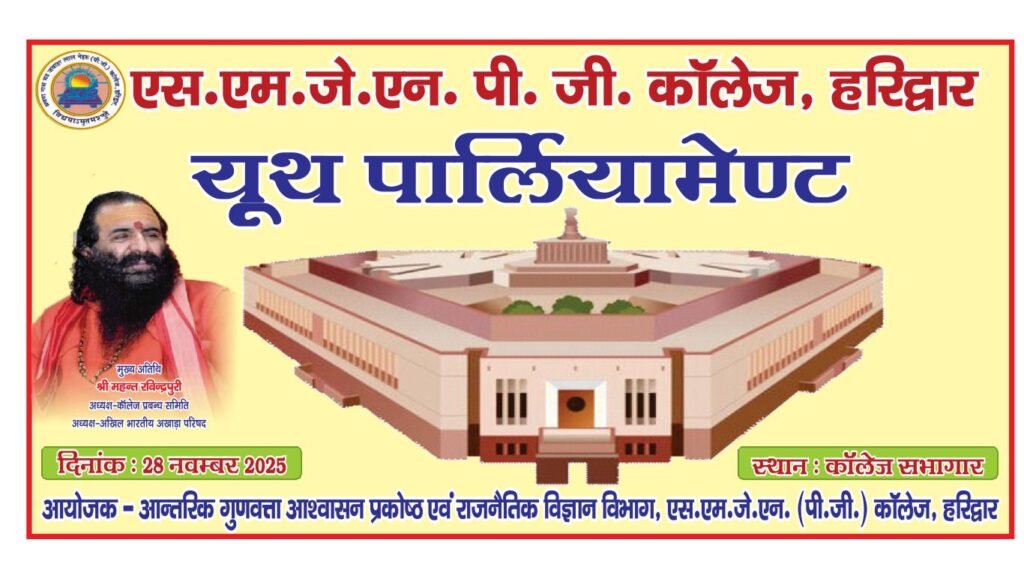 हरिद्वार। शुक्रवार को एसएमजेएन महाविद्यालय में कल दिनांक 28 नवंबर 2025 को प्रातः 11:30 बजे से यूथ पार्लियामेंट का कार्यक्रम आयोजित किया जा रहा है जिसमें मुख्य अतिथि अखिल भारतीय अखाड़ा परिषद के अध्यक्ष एवं कॉलेज प्रबंध समिति के अध्यक्ष श्री महंत रविन्द्र पुरी महाराज रहेंगे।