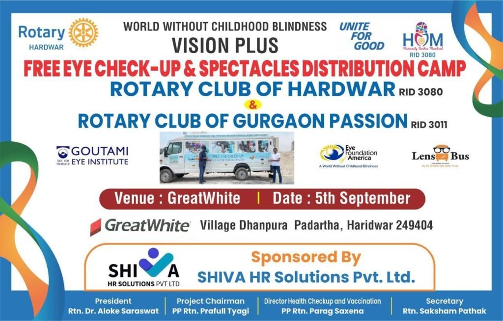 हरिद्वार। शुक्रवार को ग्रेट वाइट ग्लोबल, पदार्था के फैक्ट्री परिसर में शिवा एचआर सॉल्यूशंस के सौजन्य से रोटरी हरिद्वार ने रोटरी डिस्ट्रिक्ट 3080 के प्रोजेक्ट “विजन प्लस” की शुरुआत करते हुए एक नि:शुल्क नेत्र जांच एवं चश्मा वितरण शिविर का आयोजन किया।