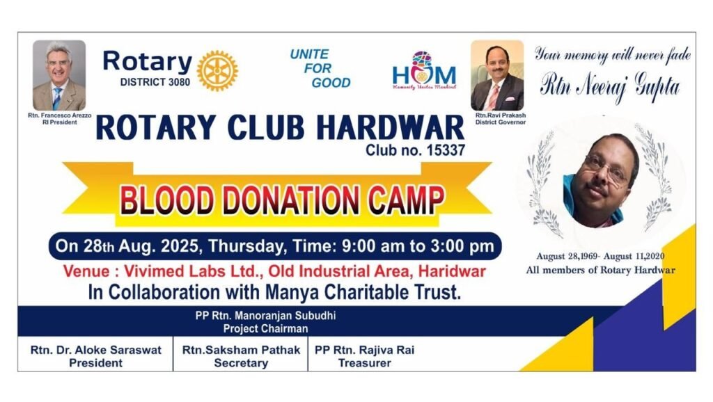 हरिद्वार। पिछले 04 वर्षों से रोटरी हरिद्वार अपने कर्मठ सदस्य एवं समाजसेवी स्व. नीरज गुप्ता की जयंती पर रक्तदान शिविर का आयोजन करता आ रहा है। इसी परंपरा को आगे बढ़ाते हुए, इस वर्ष भी रक्तदान शिविर का आयोजन किया जा रहा है।