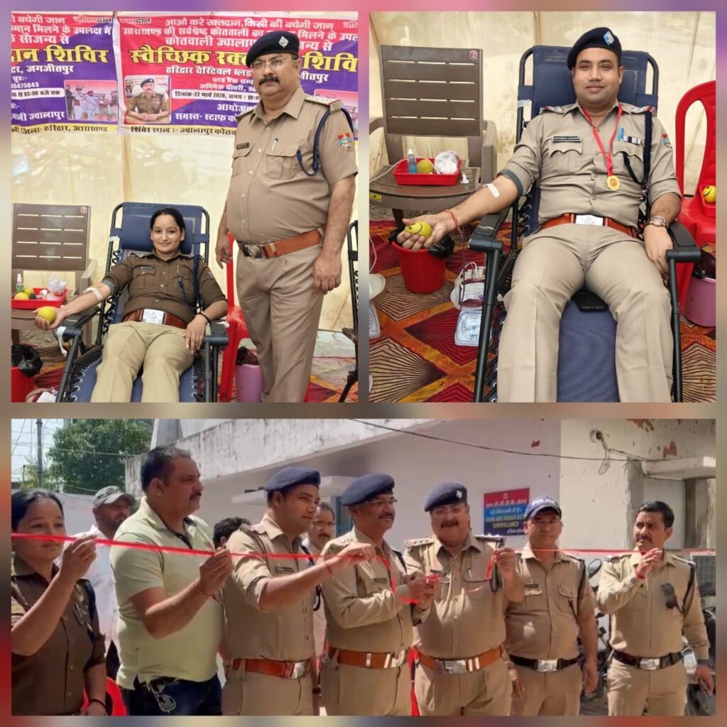 हरिद्वार। “आओ करें रक्तदान, किसी की बचेगी जान” अभियान के तहत कोतवाली ज्वालापुर पुलिस ने स्वैच्छिक रक्तदान शिविर आयोजित कर समाज सेवा का उत्कृष्ट उदाहरण पेश किया। उत्तराखण्ड की सर्वश्रेष्ठ कोतवाली का खिताब मिलने के उपलक्ष्य में आयोजित इस शिविर में पुलिस अधिकारियों, कर्मचारियों, मीडिया प्रतिनिधियों और स्थानीय नागरिकों ने बढ़-चढ़कर हिस्सा लिया।