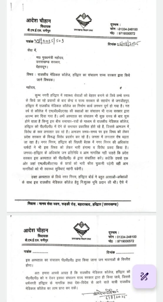 देहरादून / हरिद्वार। रानीपुर विधायक आदेश चौहान एवं हरिद्वार मेयर किरण जैसल ने मुख्यमंत्री आवास में मुख्यमंत्री पुष्कर सिंह धामी से मुलाकात कर राजकीय मेडिकल कॉलेज जगजीतपुर (हरिद्वार) को पीपीपी मोड में न देकर इसका संचालन राज्य सरकार द्वारा ही किए जाने की मांग करते हुए मुख्यमंत्री पुष्कर सिंह धामी को इस आशय का पत्र दिया। उक्त मांग पर हरिद्वार विधायक मदन कौशिक ने भी सहमति दी है।