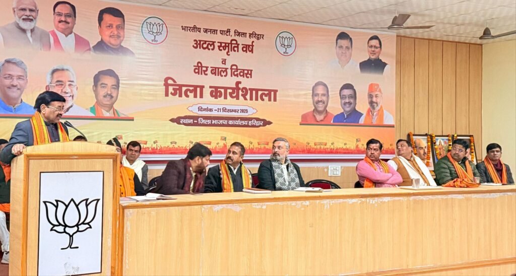 हरिद्वार। रविवार को भारतीय जनता पार्टी जिला कार्यालय जगजीतपुर, हरिद्वार पर अटल स्मृति वर्ष एवं वीर बाल दिवस के अवसर पर आयोजित किए जाने वाले कार्यक्रमों को लेकर जिला कार्यशाला का आयोजन किया गया। कार्यशाला की अध्यक्षता जिला अध्यक्ष आशुतोष शर्मा ने की, जबकि संचालन जिला महामंत्री संजीव चौधरी एवं हीरा सिंह बिष्ट द्वारा किया गया। कार्यक्रम में मुख्य वक्ता के रूप में प्रदेश उपाध्यक्ष एवं जिला प्रभारी अनिल गोयल उपस्थित रहे।