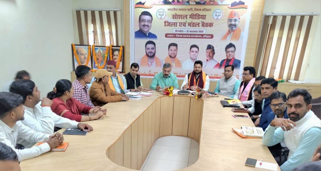हरिद्वार। बुधवार को भाजपा जिला कार्यालय पर जिला सोशल मीडिया की बैठक भाजपा जिला अध्यक्ष आशुतोष शर्मा की अध्यक्षता में आयोजित की गई। इस बैठक में मुख्य वक्ता प्रदेश सह सोशल मीडिया संयोजक गौरव सिंह ने उपस्थित मंडल अध्यक्षों व मंडल के सोशल मीडिया संयोजकों को सोशल मीडिया के विभिन्न विषयों में जानकारी देते हुए संबोधित किया की सोशल मीडिया समाचार वर्तमान घटनाओं और विभिन्न विषयों की जानकारी तथा जनता तक सरकार की उपलब्धियां तथा जानकारियां पहुंचाने का सोशल मीडिया सबसे महत्वपूर्ण साधन है फेसबुक, ट्विटर एक्स, इंस्टाग्राम, यूट्यूब तथा व्हाट्सएप के माध्यम का उचित उपयोग करते हुए संगठन को ओर मजबूत करने का आह्वान किया।