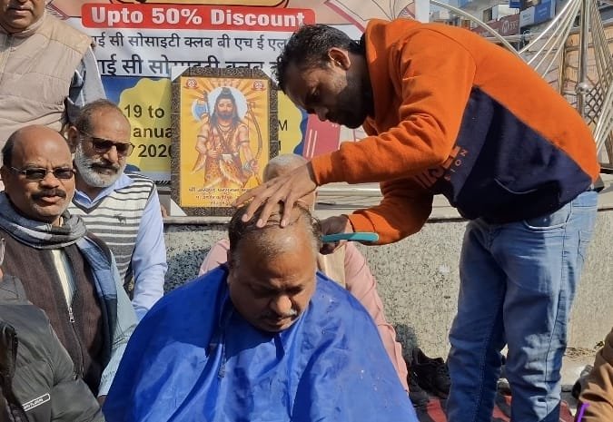 चंद्राचार्य चौक पर कार्यक्रम के दौरान अशोक शर्मा के साथ रणवीर शर्मा, मुकेश ने अपना मुंडन करवाया।