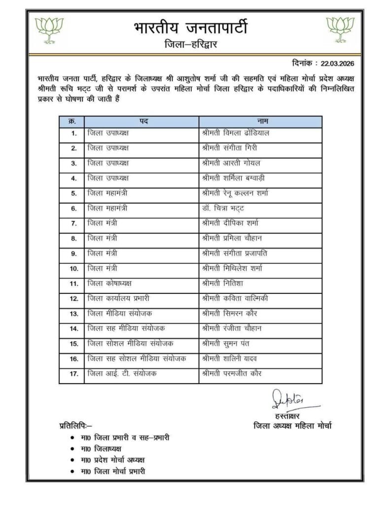 हरिद्वार। भारतीय जनता पार्टी के जिला अध्यक्ष आशुतोष शर्मा एवं महिला मोर्चा की प्रदेश अध्यक्षा रुचि भट्ट की सहमति से हरिद्वार में भाजपा महिला मोर्चा की नई टीम की घोषणा कर दी गई है। संगठन को मजबूत करने के उद्देश्य से की गई इस घोषणा में कई पदाधिकारियों को नई जिम्मेदारियां सौंपी गई हैं।