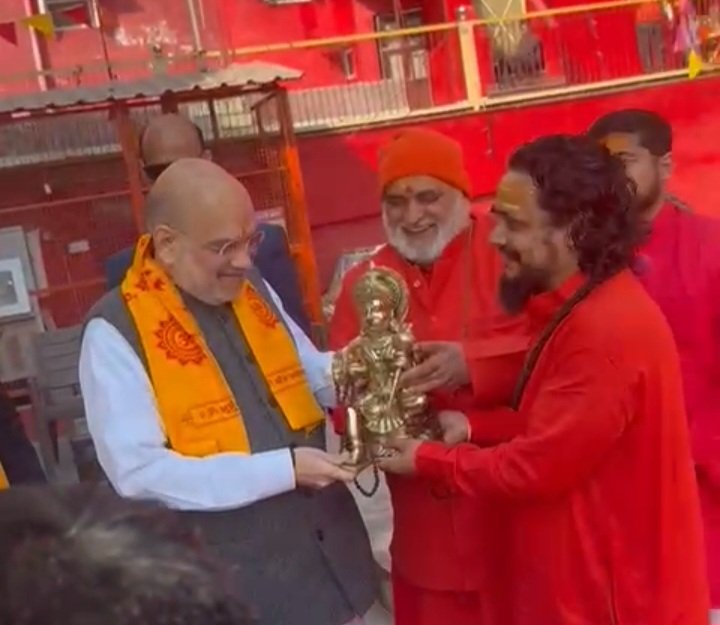 हनुमान भक्त केंद्रीय गृहमंत्री अमित शाह आज अचानक पंचायती श्री निरंजनी अbखाड़ा पहुंचे और वहां पर उन्होंने संकटमोचन हनुमान मंदिर में हनुमान जी के दर्शन किए और प्रसाद ग्रहण किया मंदिर में पहुंचने पर उनका पंचायती श्री निरंजन अखाड़ा के सचिव श्री महंत रामरतन गिरी महाराज और साधु संतों ने उनका जोरदार स्वागत किया और उन्हें मकर वाहिनी मां गंगा की प्रतिमा भेंट की बड़ी श्रद्धा के साथ अमित शाह ने हनुमान जी के दर्शन किए और उनके दरबार में मत्था टेका हनुमान जी के मंदिर में भक्तों ने जब अपने बीच में अमित शाह को पाया तो वह बहुत भावुक हो गए अचानक ही अमित शाह ने हनुमान मंदिर पहुंचने का कार्यक्रम बनाया निरंजनी अखाड़े में स्थित संकट मोचन हनुमान मंदिर एक सिद्ध पीठ है। महंत रामरतन गिरी महाराज ने बताया कि मंदिर में आकर अमित शाह बहुत भावुक हो गए और उन्होंने कहा कि मंदिर परिसर से गंगा जी का दृश्य बहुत अच्छा दिखाई देता है। अमित शाह हनुमान जी के भक्त हैं और उन्होंने अचानक ही अपना कार्यक्रम संकट मोचक हनुमान मंदिर में आने का बनाया।