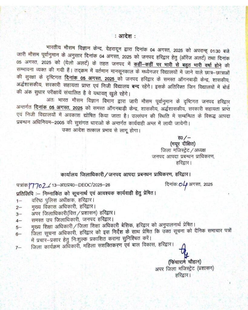 राज्य हरिद्वार में कल कक्षा 01 से 12 तक के स्कूल रहेंगे बंद, डीएम ने की छुट्टी, जानिए… admin August 4, 2025 Share this… Facebook0 Messenger Twitter Telegram Whatsapp हरिद्वार ब्रेकिंग। लगातार हो रही बारिश के चलते हरिद्वार के जिला अधिकारी मयूर दीक्षित ने कक्षा 01 से लेकर 12 तक कल रहेगी बच्चों के स्कूल की छुट्टी। Share this… Facebook0 Messenger Twitter Telegram Whatsapp