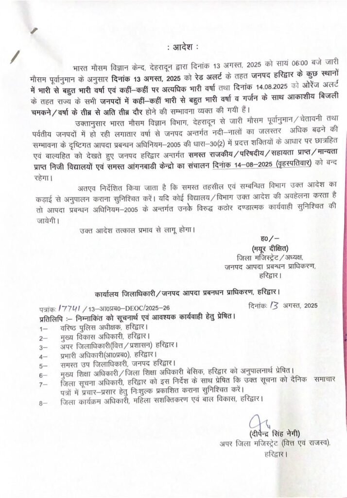 राज्य हरिद्वार में कल स्कूलों की छुट्टी घोषित, देखें आदेश… admin August 13, 2025 (Last updated: August 13, 2025) 0 comments Share हरिद्वार। हरिद्वार में कल जिलाधिकारी मयूर दीक्षित ने सभी स्कूलों की छुट्टी घोषित की है, दरअसल मौसम विभाग द्वारा भारी बारिश की चेतावनी दी गई है जिसके बाद हरिद्वार के जिलाधिकारी मयूर दीक्षित ने सभी स्कूलों की छुट्टी घोषित कर दी है। About the Author admin Administrator Visit Website View All Posts Share Post navigation Previous: विभाजन विभीषिका स्मृति दिवस, लाखों बलिदानियों को भावभीनी श्रद्धांजलि…Next: पूर्व कैबिनेट मंत्री स्वामी यतीश्वरानंद के नेतृत्व में लालढांग मंडल में निकाली भव्य तिरंगा यात्रा… Leave a Reply Cancel replyYour email address will not be published. Required fields are marked *Comment * Name * Email * Website Save my name, email, and website in this browser for the next time I comment. Related Stories राज्य अखाड़ा परिषद अध्यक्ष श्रीमहंत रविंद्रपुरी ने की स्वामी रामेश्वरानंद सरस्वती के शीघ्र स्वस्थ्य होने की प्रार्थना… admin April 4, 2026 0 राज्य अंडर-14 क्रिकेट टूर्नामेंट में हरिद्वार स्पोर्ट्स कॉम्प्लेक्स की टीम ने लहराया जीत का परचम admin April 3, 2026 0 राज्य सुराज सेवा दल ने खोला आबकारी विभाग के खिलाफ मोर्चा, मुख्यालय पर किया जोरदार प्रदर्शन, जानिए कारण admin April 3, 2026 0