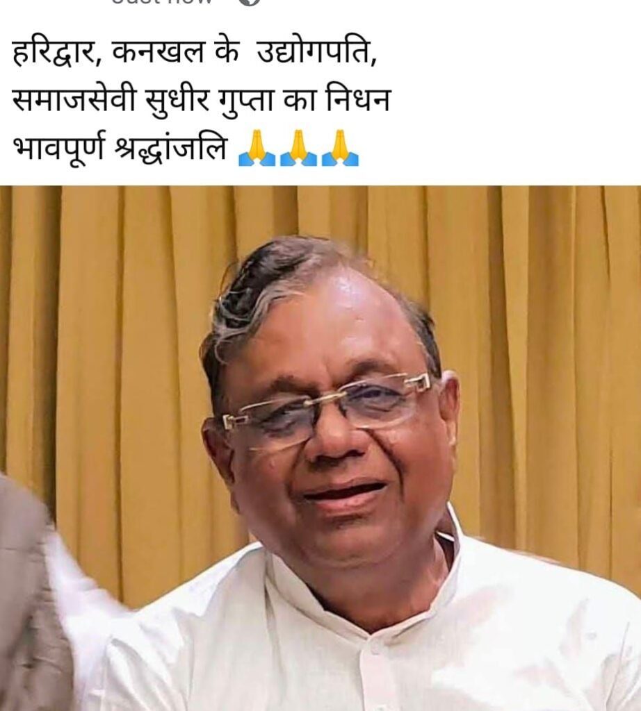 हरिद्वार। कनखल के प्रसिद्ध उद्योगपति और समाजसेवी सुधीर गुप्ता का सोमवार को दिल्ली मेदांता हॉस्पिटल में निधन हो गया है। 75 वर्ष की आयु में सुधीर गुप्ता ने आखिरी सांस ली, वे पिछले कई दिनों से मेदांता हॉस्पिटल में भर्ती थे, जहां उनका इलाज चल रहा था आज उनका निधन हो गया है उनके निधन से कनखल सहित शहर में शोक की लहर दौड़ पड़ी।